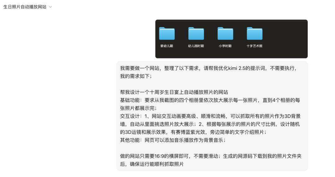 输出的结果差强人意,而且照片加载不了,再要修改也很麻烦。回看了Kimi官方给出的网站案例,我认为是我的提示词太简单,于是让Kimi给我输出一套提示词。