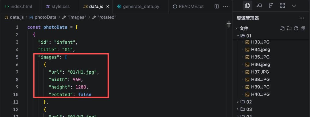 所以,回看开头截图,让AI写了data.js文件用于存放不同文件夹的照片数据,包括路径名称、宽高像素以及是否选择。